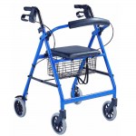 Possui 4 rodas maciças de 200mm, sendo as rodas dianteiras direcionais e as rodas traseiras dotadas de travões, que se acionam através dos manípulos incluídos nas pegas, permitindo a realização de marcha com segurança e de forma contínua (por ter rodas, não necessita parar para levantar e deslocar o andarilho), em espaços interiores e exteriores.