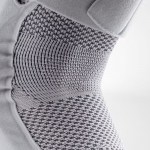 Ortótese de joelho confecionada em tecido elástico e desenho anatómico, com hastes laterais com controle flexo-extensão e almofada viscoelástica integrada ao tecido que envolve a rótula, exercendo uma massagem para reabsorção de edema e hematomas. O tecido é comprimido para estimular a propriocepção e facilitar a recuperação articular.