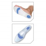 Palmilha com suplementos de gel de silicone, na zona metatársica e no calcanhar. Recomendado para dores musculares, tendinites, metatarsalgias e talalgias. Reforço do tecido da fascia plantar. Alivio de pés cansados. Fabricada em silicone. Protege a pele e tecido cutâneo. Lavável.